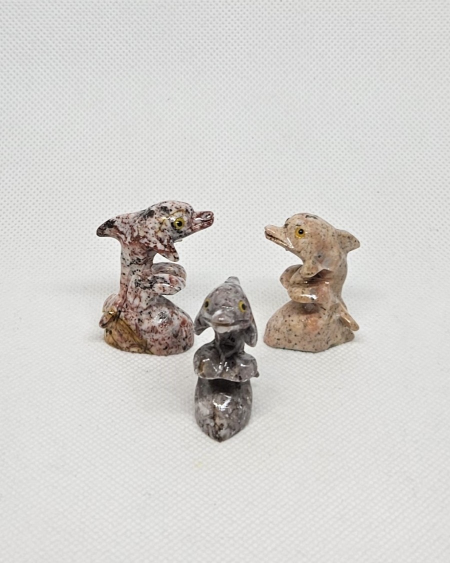 Figurka delfína na mořské vlně vybroušená z peruánského kalcitu, o velikosti cca 3,5 cm.
