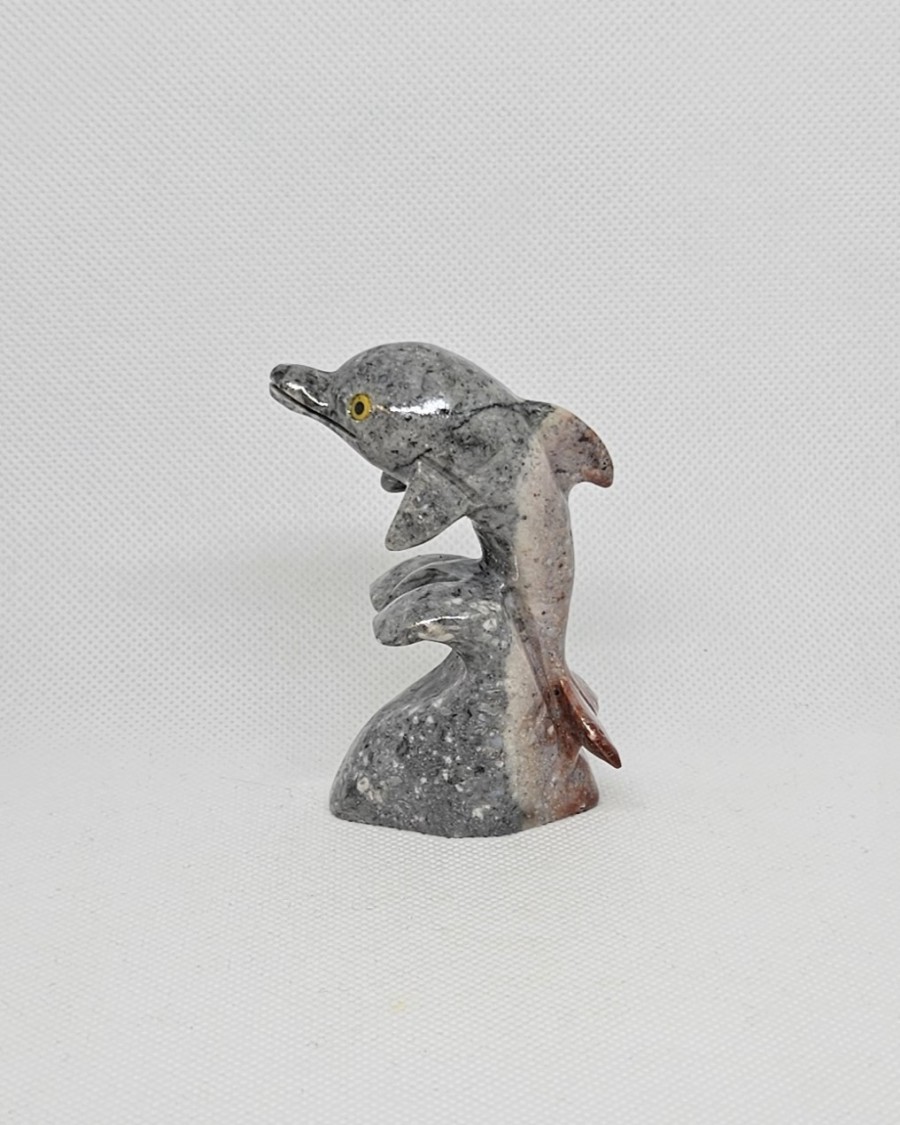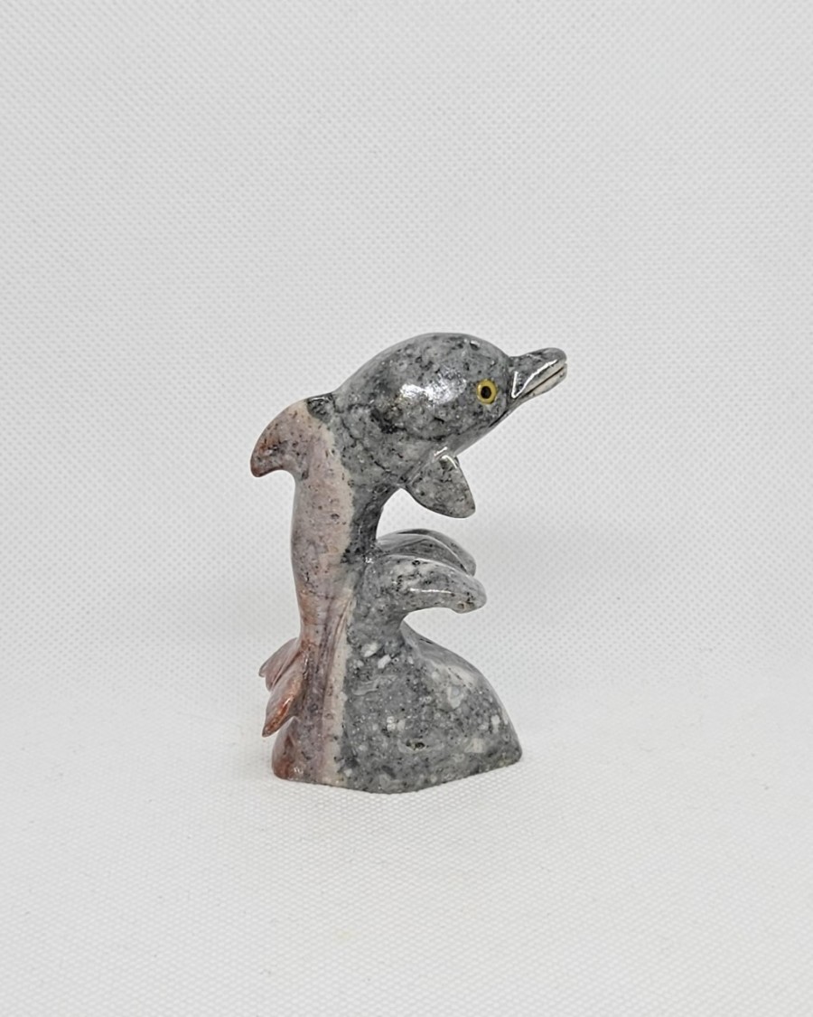 Figurka delfína na vlně vybroušená z peruánského kalcitu, o velikosti cca 7,5 cm, hmotnost cca 100 g.