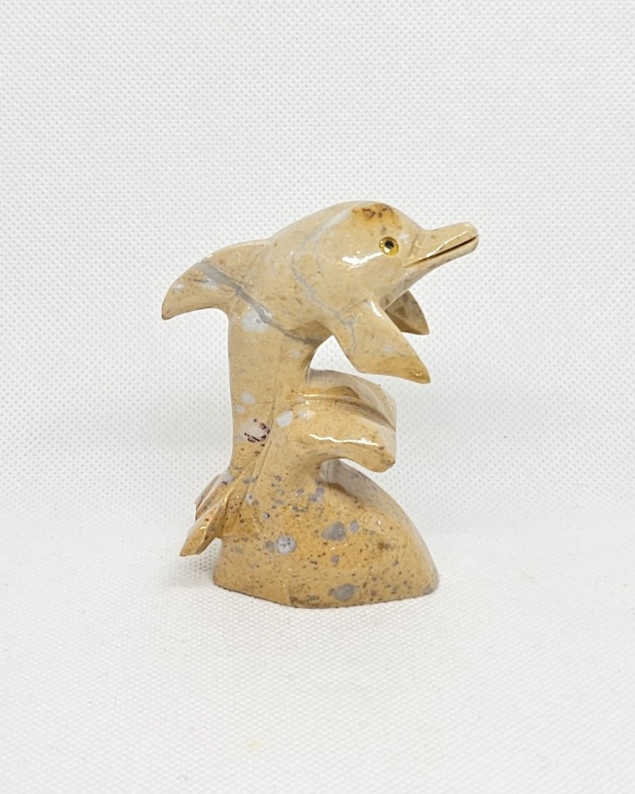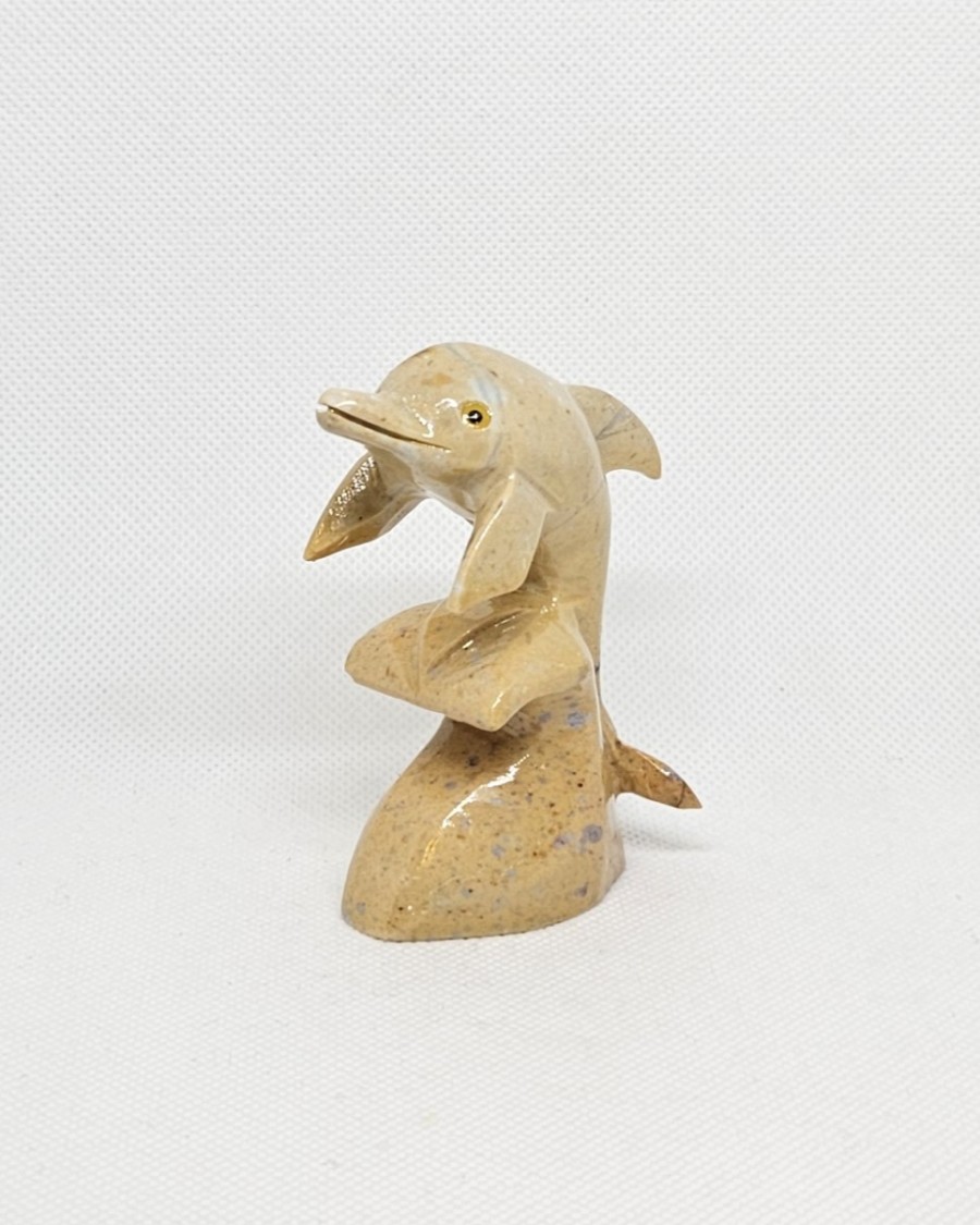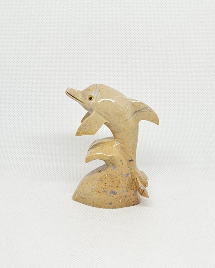 Figurka delfína na vlně vybroušená z peruánského kalcitu, o velikosti cca 7,5 cm, hmotnost cca 115 g.