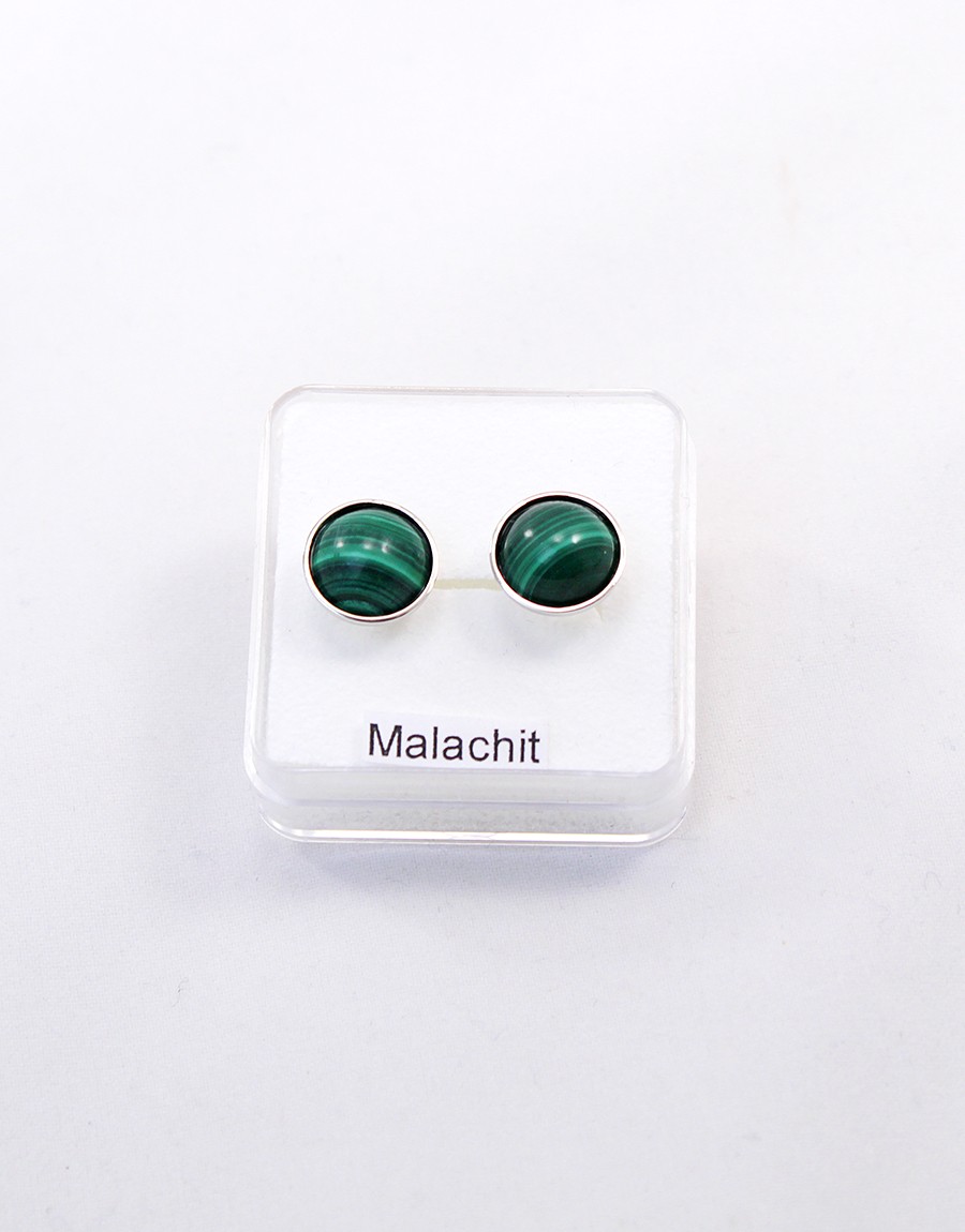 Náušnice tvoří kovové lůžko s vlepenou půlkuličkou malachitu.
