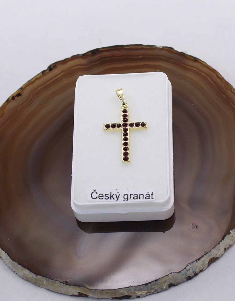 Kovový bižuterní přívěsek ve tvaru křížku, z kovu žluté barvy s několika malými kuličkami českého granátu.