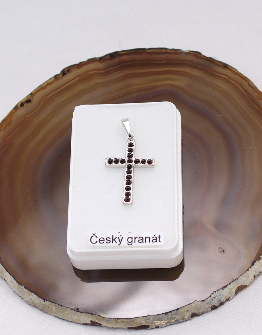 Kovový bižuterní přívěsek ve tvaru křížku, z kovu bílé barvy s několika malými kuličkami českého granátu.