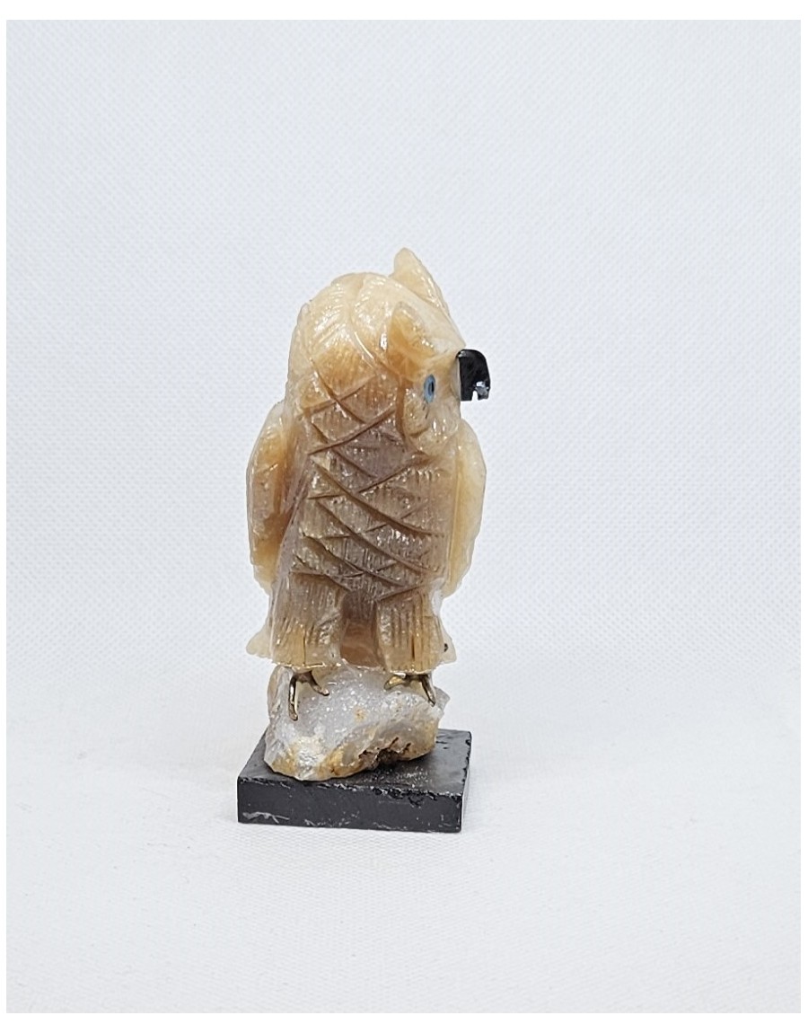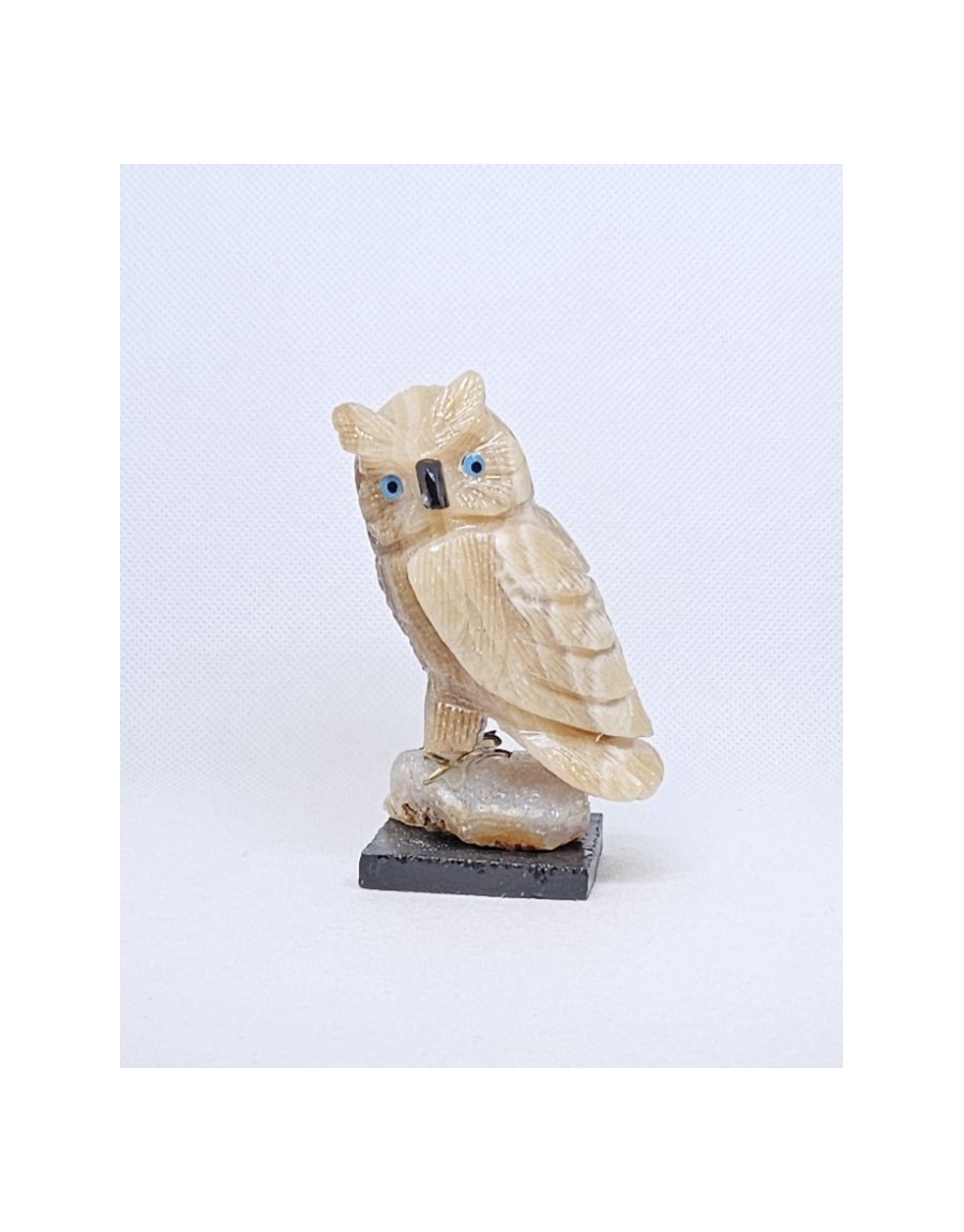 Malá figurka hnědé sovy, vybroušená a sestavená z několika druhů polodrahokamů, podstavec tvoří kalcitová destička a drúzička chalcedonu.