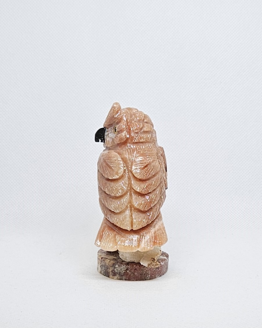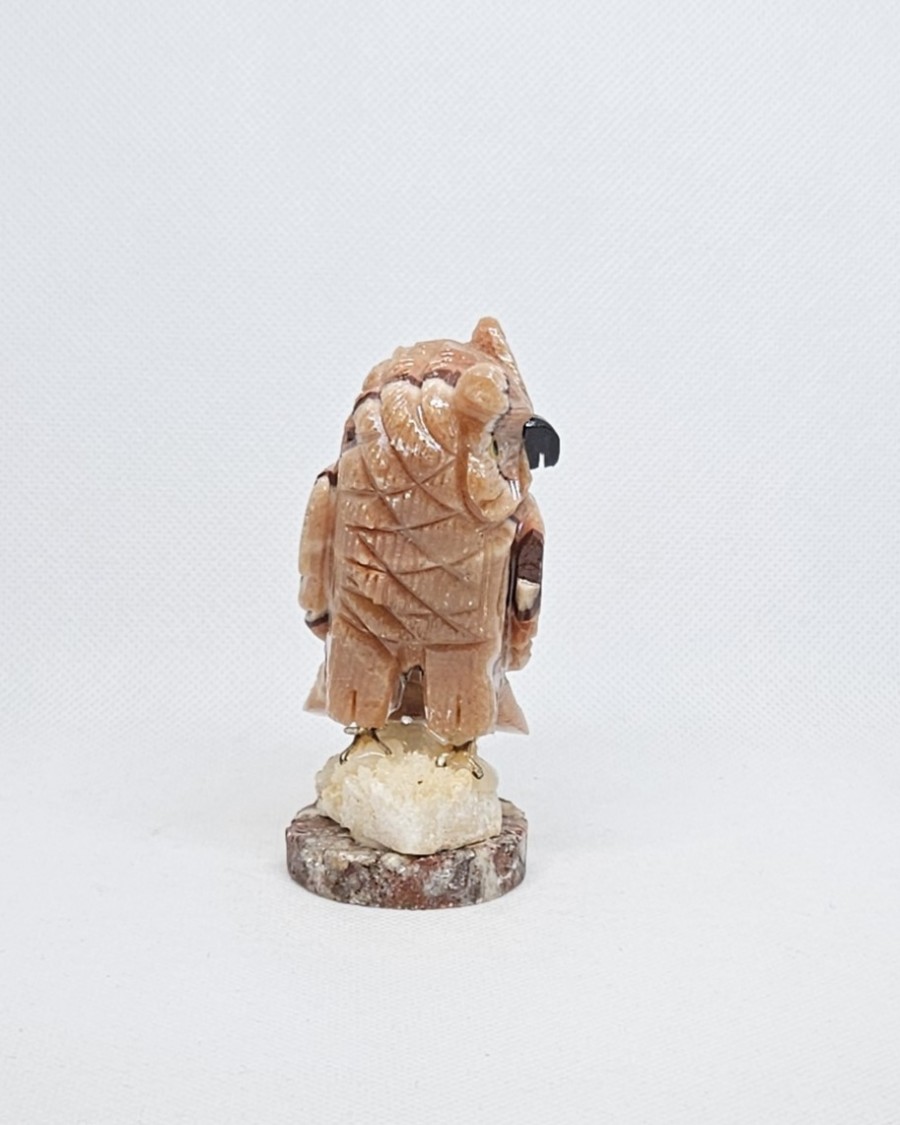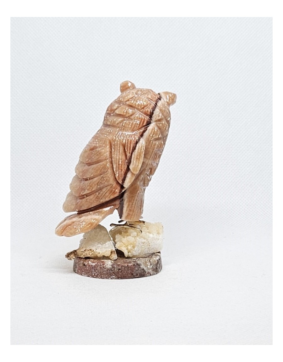 Malá figurka hnědé sovy, vybroušená a sestavená z několika druhů polodrahokamů, podstavec tvoří kalcitová destička a drúzička kalcitu.