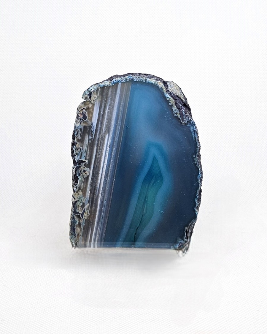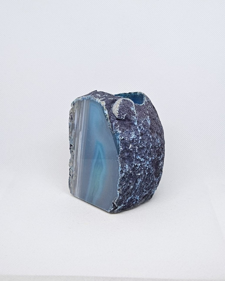 Část achátové geody uměle zbarvený do odstínů modré, s navrtanou dutinou pro čajovou svíčku, spodní část je pro ochranu povrchu nábytku opatřena čtyřmi prakticky