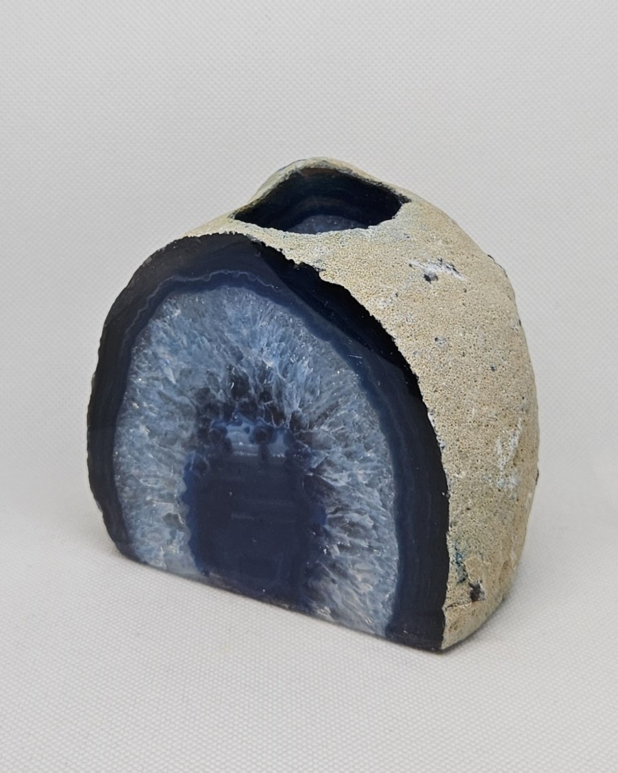 Krásný achát uměle zbarvený do odstínů modré, s navrtanou dutinou pro čajovou svíčku, spodní část je pro ochranu povrchu nábytku opatřena čtyřmi prakticky neviditelnými