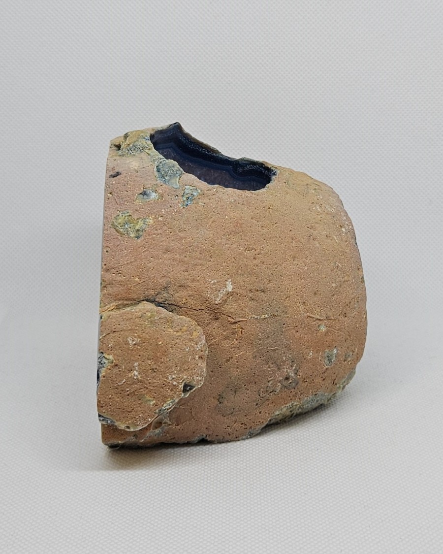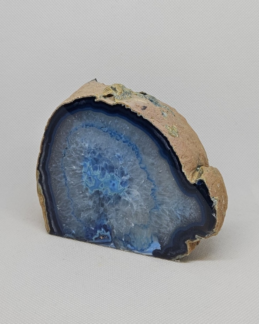 Krásný achát uměle zbarvený do odstínů modré, s navrtanou dutinou pro čajovou svíčku, spodní část je pro ochranu povrchu nábytku opatřena